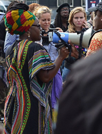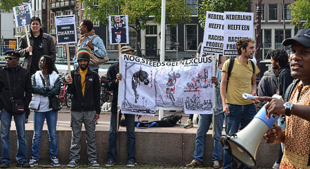 De eerste spreker sprak schande van “de rotstreek” die de burgemeester in 2013 had geleverd door alleen de oorbellen van de Zwarte Piet-figuur te verwijderen en de rest van de vernederende karikatuur intact te laten. “Wat is de bedoeling daarvan? Wil de burgemeester het goud van de oorbellen van Zwarte Piet laten omsmelten, zoals witte Nederlanders in de koloniale tijd ook al goud en zilver roofden?” Op zijn aangeven scandeerden de demonstranten keihard: “Rotstreek, rotstreek”, ongetwijfeld tot ergernis van Van der Laan, die zich misschien ergens in een hoekje van het stadhuis zat te verbijten. Een spreker namens het Landelijk Platform Slavernijverleden benadrukte dat de transatlantische slavernij pas sinds 2001 officieel wordt erkend als misdaad tegen de menselijkheid. Onder die misdaad valt ook het gebruik van raciale stereotyperingen, zoals Zwarte Piet. “Desondanks heeft de burgemeester aangegeven dat hij nog een paar jaar doorgaat met die misdaad. Want hij wenst de Zwarte Piet-figuur alleen maar geleidelijk af te gaan bouwen, in plaats van hem meteen af te schaffen.” Hij vergeleek dat hedendaagse “gedoogbeleid”, dat racisme dus in stand houdt, met de vroegere overheidsmaatregel om na de afschaffing van de slavernij in 1863 de voormalige tot slaaf gemaakten nog tien jaar te verplichten om voor de voormalige slavenhouders te blijven werken. De slavenhouders kregen zelfs financiële compensatie van de Nederlandse overheid voor het verlies van hun “eigendom”.