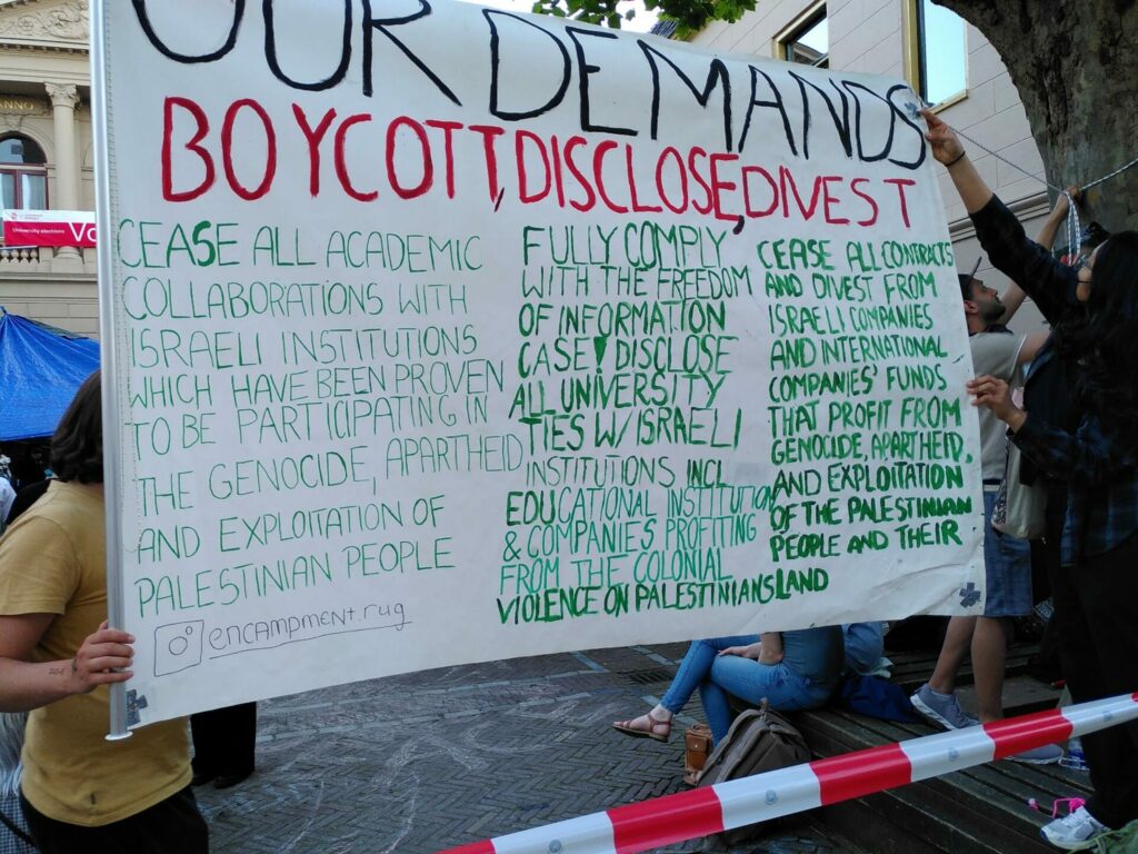 3. Na een opmerking van onvrede over het vandalisme tijdens de protesten wordt de “achterliggende vraag” wel “legitiem” genoemd. Die vraag formuleren zij zo: “hoe verhouden wij ons tot onze zusterinstellingen in gebieden waar zich een grootschalig conflict afspeelt?” Hiermee laten de universiteiten al zien waar zij politiek staan. Dit is namelijk helemaal niet de vraag. Het gaat niet over de verhouding met “zusterinstellingen in gebieden waar zich een grootschalig conflict afspeelt” maar over hun eigen medeplichtigheid bij oorlogsmisdaden.