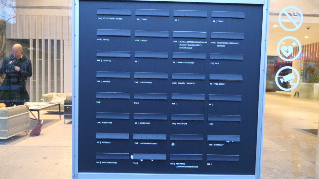 Zoals ze zelf na de manifestatie onthulden, waren drie beveiligers al vanaf acht uur vanochtend in touw voor het geval dat we eerder kwamen. Het was een lange dag nietsdoen, en helemaal goed opletten deden ze niet vanavond, want aan het einde van de manifestatie stelden veel actievoerders zich onopvallend zo op dat twee van hen uit het zicht van de bewakers een reeks posters op de ruiten konden plakken.