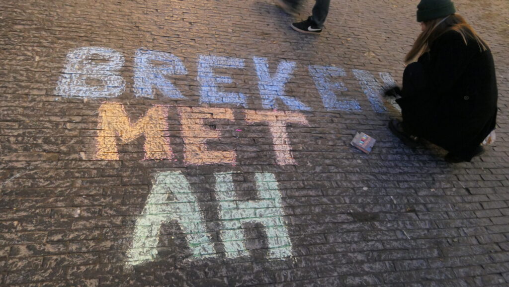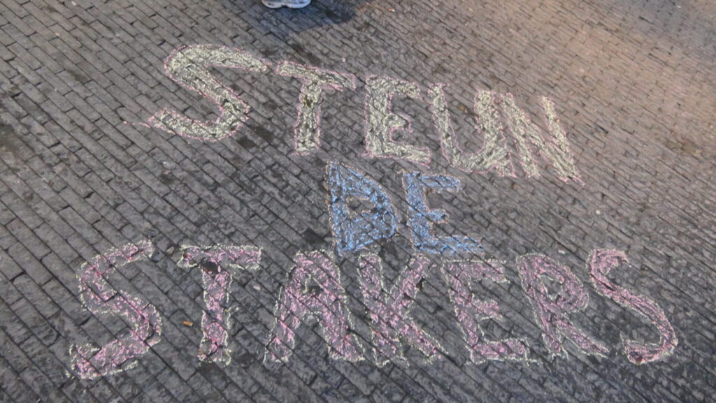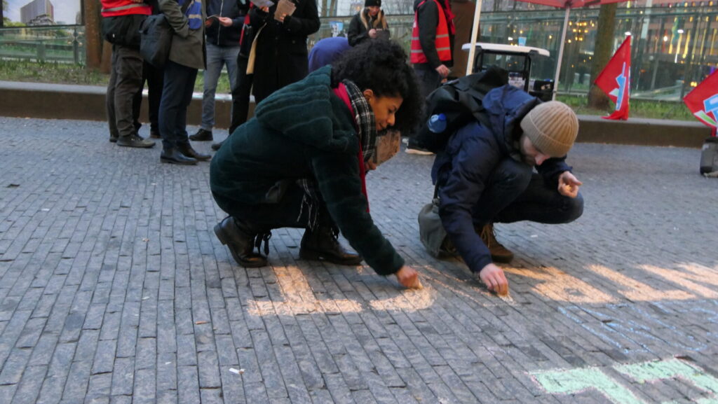 Gedurende ruim een uur werden er heel veel flyers uitgedeeld en gesprekjes gevoerd met voorbijgangers. Over het algemeen werd er instemmend gereageerd. Ondertussen werden er leuzen gekrijt op straat en waren er drie korte toespraakjes vanuit de FNV. De speech van Ron Blom lees je hieronder.
