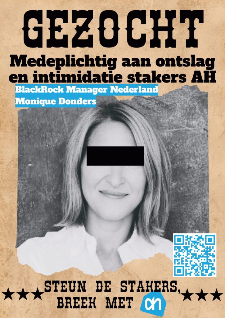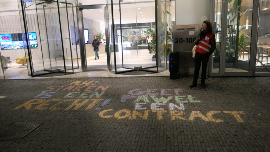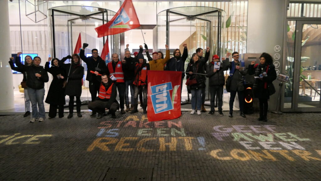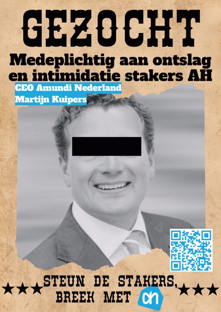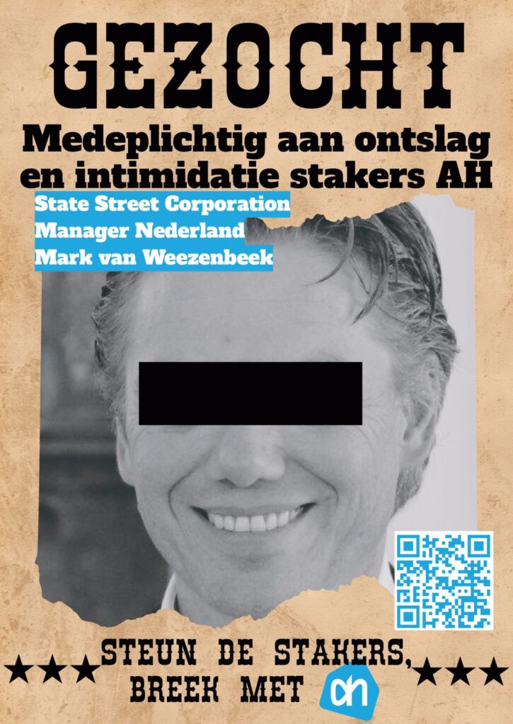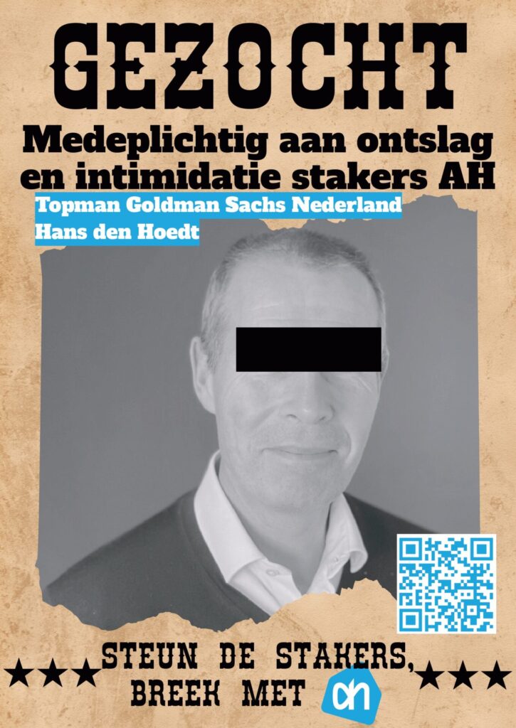 Vanavond hebben zo’n 25 mensen actie gevoerd bij de AH-aandeelhouders Amundi en Goldman Sachs aan de Amsterdamse Zuidas. Albert Heijn ontsloeg Paweł Rudzki omdat hij een van de leiders was afgelopen zomer bij de staking voor gelijke rechten voor arbeidsmigranten met uitzendcontracten in het AH-distributiecentrum in Pijnacker. Paweł was al ruim acht (!) jaar uitzendkracht bij Albert Heijn.