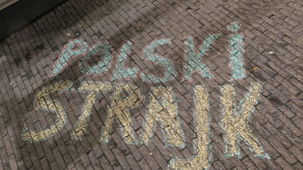 Dat deden we door samen te werken, door solidariteit. Die solidariteit willen we vandaag betonen aan Paweł. Geef Paweł zijn baan terug! Stop intimidatie van vakbondsleden! Respecteer werknemersrechten! Dank jullie wel!