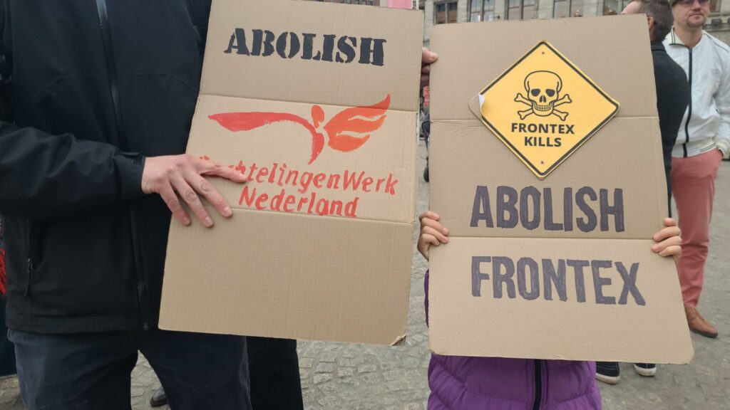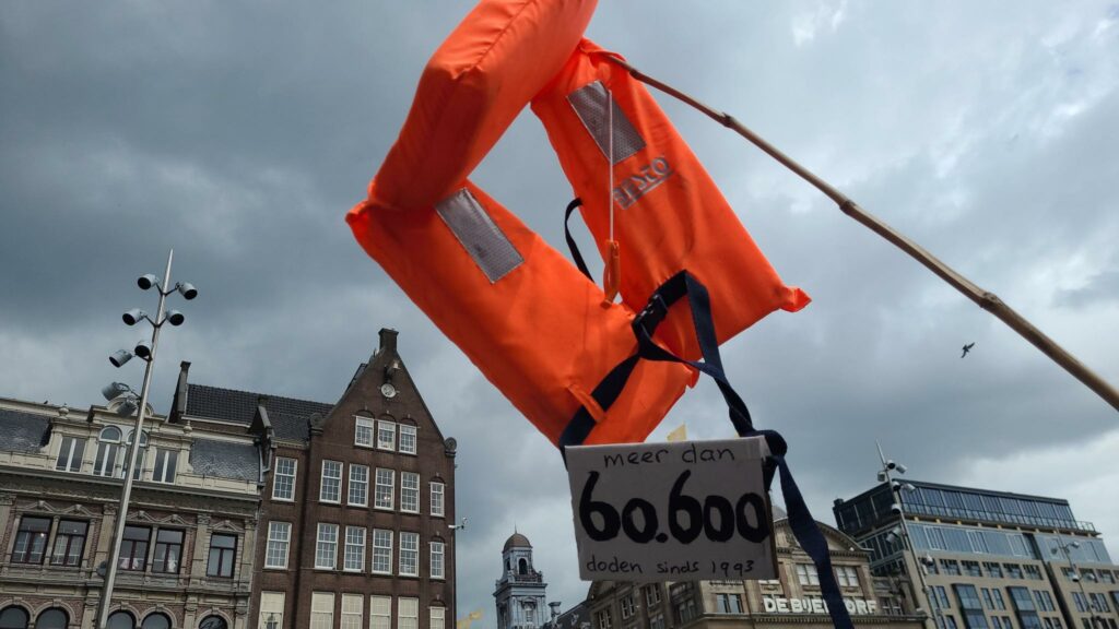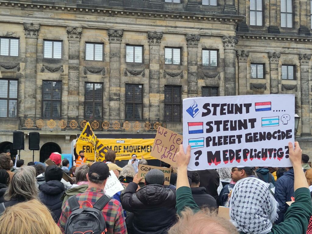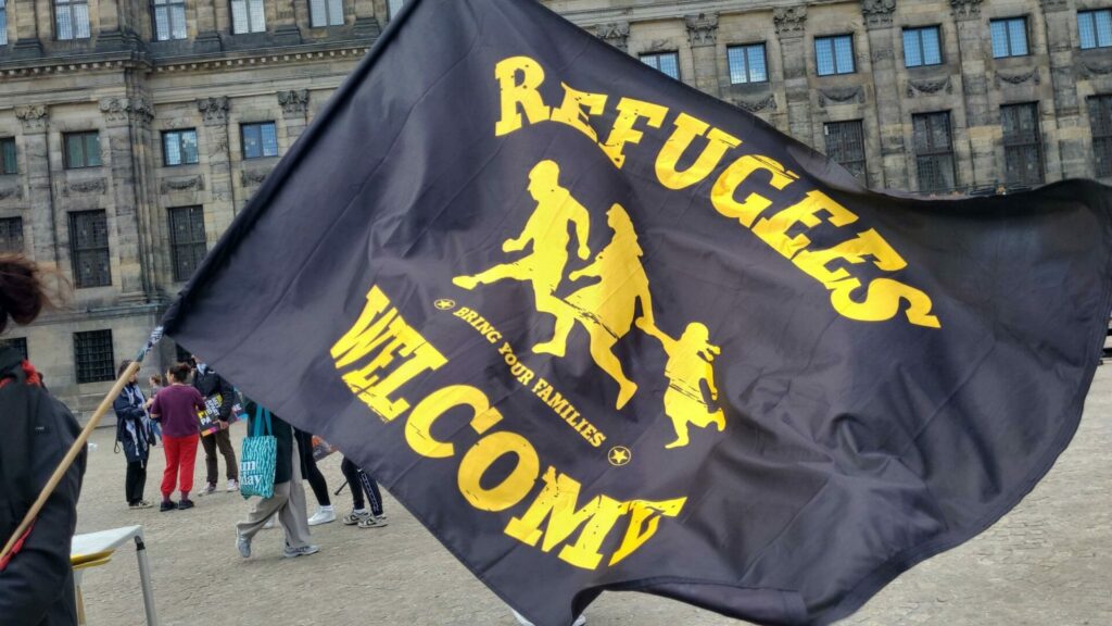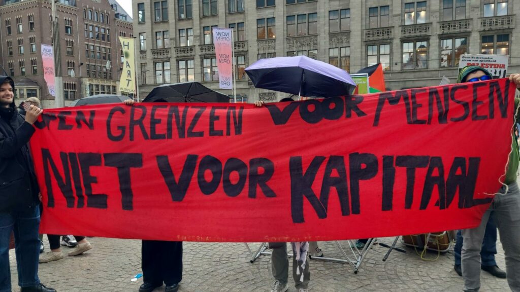 Na de toespraken op de Dam begonnen vele honderden mensen aan een tocht door het centrum van Amsterdam. Voor het publiek dat stond toe te kijken en ook foto’s stond te nemen moesten de kopspandoeken boekdelen spreken: “Migration is a human right” en “Freedom of movement, abolish borders”. De stoet zette zich langzaam voort en bleef vooral op het Rokin herhaaldelijk stil staan, waardoor nog meer toeschouwers het geheel goed konden bekijken. De politie was weliswaar vrij massaal aanwezig, maar hield zich koest en werd dus niet zo repressief en agressief als we de laatste tijd helaas gewend zijn bij Palestina-acties. Bij terugkeer op de Dam kwamen het dansen spontaan op gang, onder begeleiding van een afsluitend concert. Zaterdag spatte de energie en strijdbaarheid er vanaf, en die kracht moeten we gaan inzetten tegen de extreem-rechtse machthebbers die de levens van migranten en vluchtelingen steeds meer dreigen te gaan vermorzelen.