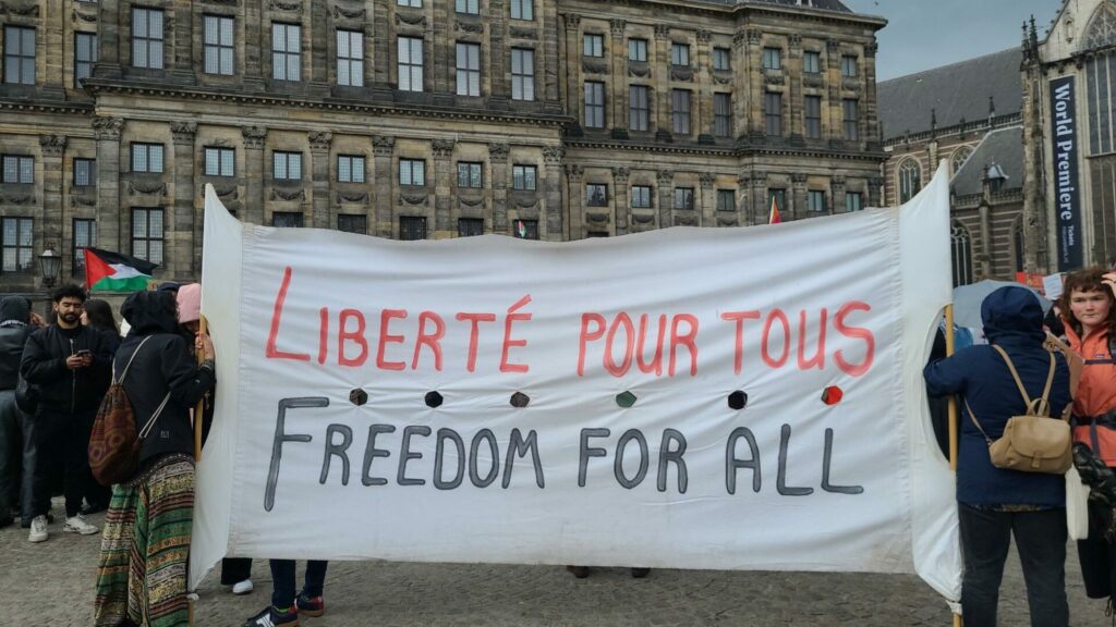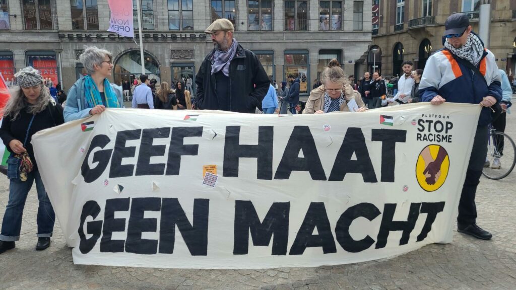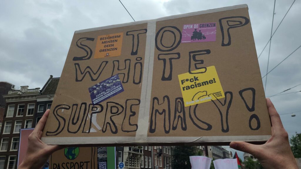 Op de Dam konden we luisteren naar vlammende toespraken, die zo verschilden van de vaak nogal plichtmatig, zakelijk en afstandelijk aandoende praatjes van vertegenwoordigers van grote ngo’s en andere belangengroepen in het maatschappelijke middenveld. Zaterdag werd er recht en indrukwekkend uit het hart gesproken en werden er onophoudelijk leuzen geschreeuwd die zorgden voor beroering en ontroering. Wij allemaal, mensen van kleur, witte bondgenoten, jong en oud, cis en queer, wij voelden de woede en we merkten de overlevingsstrijd die migranten en vluchtelingen moeten voeren, op weg naar Europa, binnen Europa en zeker ook in Nederland. We hapten naar adem toen we luisteren naar woorden over wat de Palestijnen overkomt en hoe dat is verbonden met het wereldwijde gevecht tegen witte suprematie en koloniale overheersing. We hoorden verhalen over vluchtelingen die zich tot in het vliegtuig hadden verzet tegen hun deportatie. We namen tot ons dat in zoveel landen geweld en oorlog en klimaatvernietiging ontbrandt. En de witten onder ons kregen de boodschap mee dat ze hun privileges konden en ook moesten gebruiken om steeds opnieuw de strijd aan te gaan tegen afwijzing, uitsluiting, opsluiting en uitzetting.