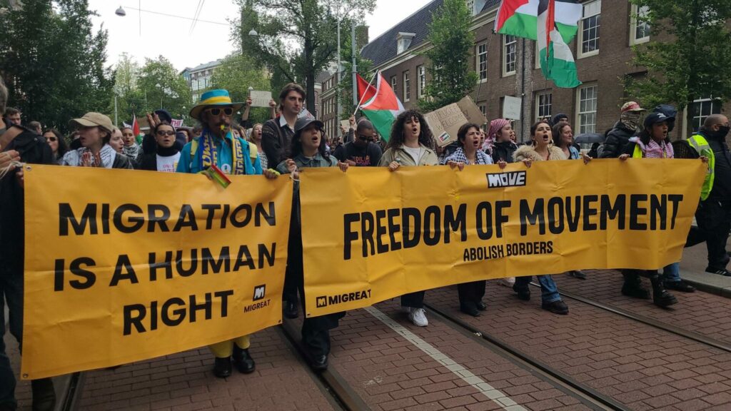 Afgelopen zaterdag vond in Amsterdam voor de tweede keer een vibrerende en inspirerende MOVE demonstratie plaats, georganiseerd door MiGreat. Evenals die van vorig jaar had ook deze demonstratie een radicaal en van onderop karakter. Mensen beschermen, grenzen afschaffen, niemand is illegaal en vrijheid van beweging waren de kerngedachten waarmee de demonstratie was opgezet. Afgezien van een enkele witte spreker kwamen alleen mensen van kleur aan het woord, vluchtelingen en migranten die fel en krachtig vanuit hun eigen ervaringen de verschrikkelijke politiek van migratiebeheersing aanklaagden. Ook was er volop inbreng vanuit de Palestina-beweging.