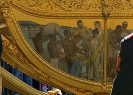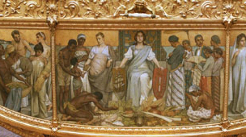 Een ander deel van het paneel.“Het zijpaneel “Hulde der koloniën” roept bij ons grote weerstand op”, schrijven de critici. “Op dat zijpaneel worden namelijk halfnaakte mannen en vrouwen afgebeeld die hun rijkdommen aanbieden aan het koningshuis. In de koloniale tijd en de nadagen van de slavernij leek een dergelijke afbeelding heel gewoon. Nu herinnert het ons aan een gruwelijke periode in de Nederlandse geschiedenis. Nederland worstelt nog steeds met het koloniale verleden. Nabestaanden van de Nederlandse massamoord in het Indonesische dorpje Rawagede vragen om genoegdoening door de Nederlandse staat, maar die beroept zich op verjaring. Nazaten van tot slaven gemaakten op de Antillen en in Suriname vragen excuses van de Nederlandse overheid, maar zien het enige kennisinstituut over de Nederlandse slavernij, het NINSEE, met opheffing bedreigd. Kennelijk moet de meest beschamende bladzijde van de Nederlandse geschiedenis uit het collectieve geheugen worden verdrongen.” De auteurs doen ook een beroep op de koningin, die “wellicht” de regering een duwtje in de goede richting zou kunnen geven door het paneel “de plaats te geven waar het thuishoort: het Rijksmuseum”.