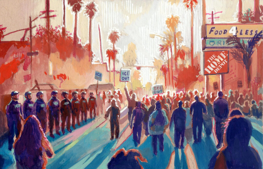 Los Angeles is al heel lang een soort proeftuin voor militaire onderdrukking in de stad – de politie van L.A. heeft de SWAT-teams uitgevonden en was de eerste die politiehelikopters inzette. Maar op 6 juni zette de federale overheid de eerste stap in wat Trump “de grootste deportatieoperatie in de Amerikaanse geschiedenis” noemde. Daarmee werd Los Angeles, in de woorden van burgemeester Karen Bass, een “proefterrein” voor hun fascistische razzia’s in Amerikaanse steden. De hele zomer lang stuurde DHS gewapende, gemaskerde agenten naar diezelfde bouwmarkt bij MacArthur Park – voor zowel kleine, snelle arrestaties als grootschalige razzia’s die behalve voor de aanhoudingen ook bedoeld waren het spektakel. Ze ontvoerden er arbeiders, straatverkopers en omstanders, allemaal zonder arrestatiebevelen of waarschuwing vooraf.