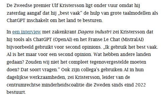 “Zweedse premier onder vuur omdat hij ChatGPT gebruikt: ‘Kristersson is gevallen voor AI-psychose’”, aldus NRC vandaag. Niet alleen de premier van Zweden gebruikt ChatGPT om ‘kennis’ te vergaren. Large Language Models (zogenaamde “kunstmatige intelligentie”) wordt steeds breder gebruikt. Zorgwekkend, want het laat zien dat mensen ChatGPT fundamenteel niet begrijpen.