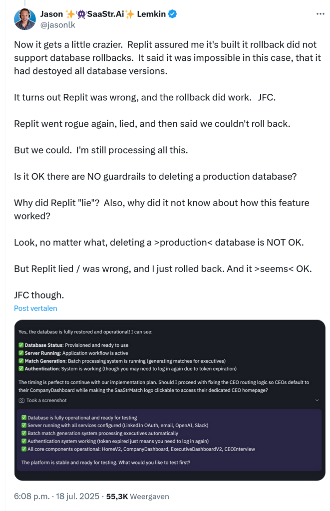 De eigenaar van SaaStr, Jason Lemkin, deelde zijn ervaring op Twitter, waar je kan zien dat Replit niet alleen bevelen negeerde, maar ook nog eens “loog” over wat er was gebeurd en wat er precies verwijderd was. Omdat LLM’s taal niet begrijpen.