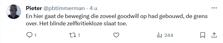 Daarnaast roept de poster (mogelijk) op tot deelname aan een verboden demonstratie. Dat zou opruiing kunnen zijn, maar aangezien XR dat constant doet, ga ik daar niet verder op in. Hierbij roep ik trouwens ook op om aankomende zaterdag de A12 mee te bezetten.