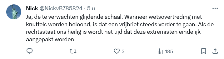 Want waar de een een ludieke actie ziet, ziet de ander “terrorisme”. Er wordt een “grens” overgegaan, waarbij die grens schijnbaar het eigendomsrecht is. Deze mensen geven niet zozeer om regels, maar willen XR aangepakt zien, en grijpen naar alle “regels” die ze kunnen bedenken.