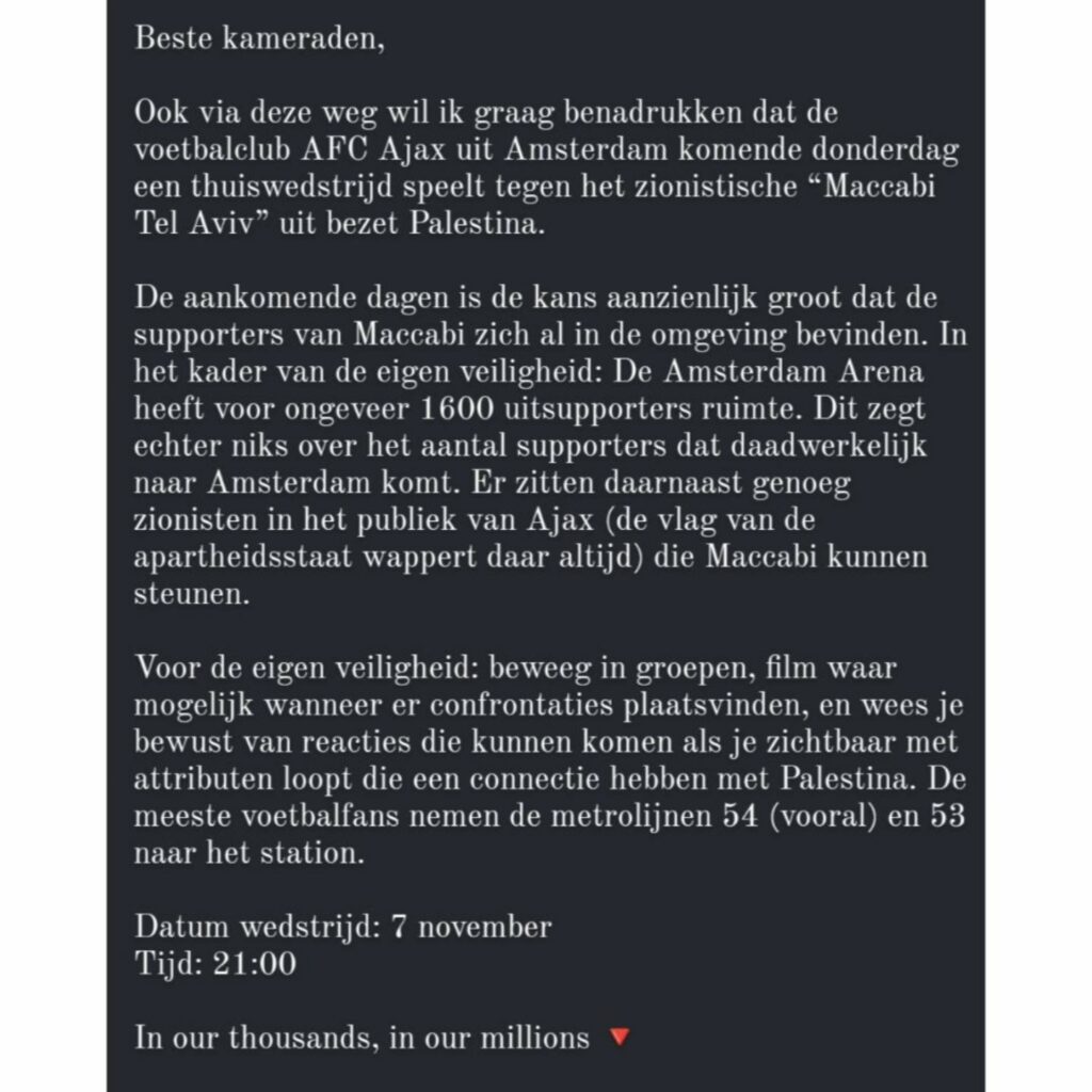 In reactie op het nieuws dat deze harde kern, waaronder de Maccabi Fanatics, naar Nederland komt, reageert de Amsterdamse pro-Palestijnse gemeenschap. Organisaties waarschuwen om uit te kijken, zeker met het dragen van bijvoorbeeld keffiyeh’s.