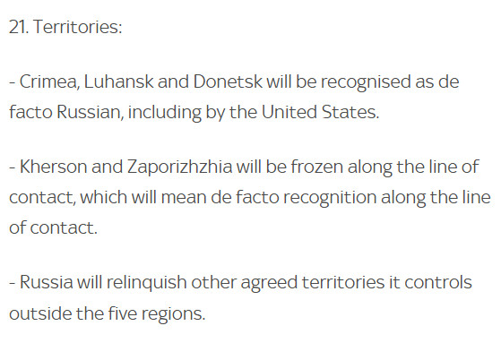 Het meest in het oog springt punt 21, de bepalingen rond overdracht van grondgebied. Rusland wordt beloond voor de originele agressie met grote grondgebieden, groter dan de gebieden die zij nu militair beheersen. Russische soevereiniteit over de Krim wordt erkend.