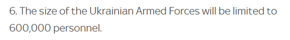 Daarnaast moet Oekraïne, in tegenstelling tot Rusland, de omvang van het leger verkleinen. Dit maakt Oekraïne vatbaarder voor toekomstige agressie vanuit Rusland, zolang Rusland zelf ook niet demilitariseert.
