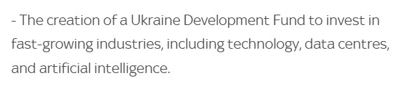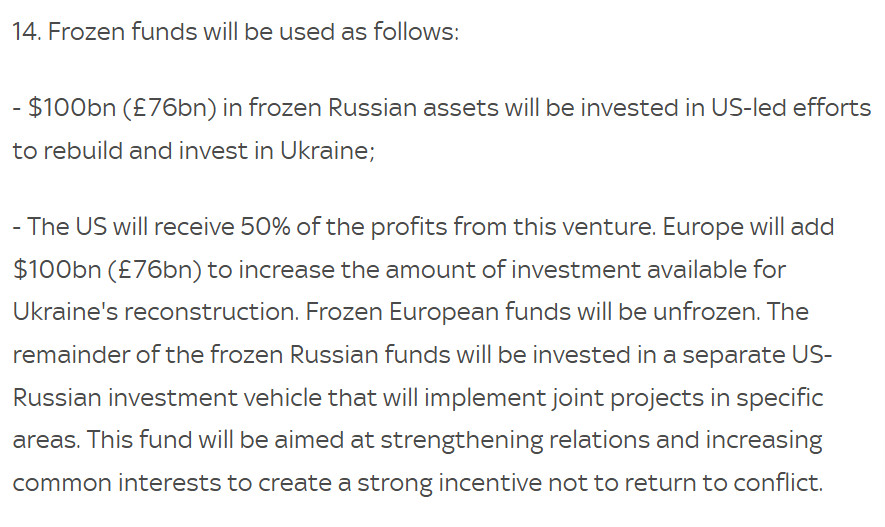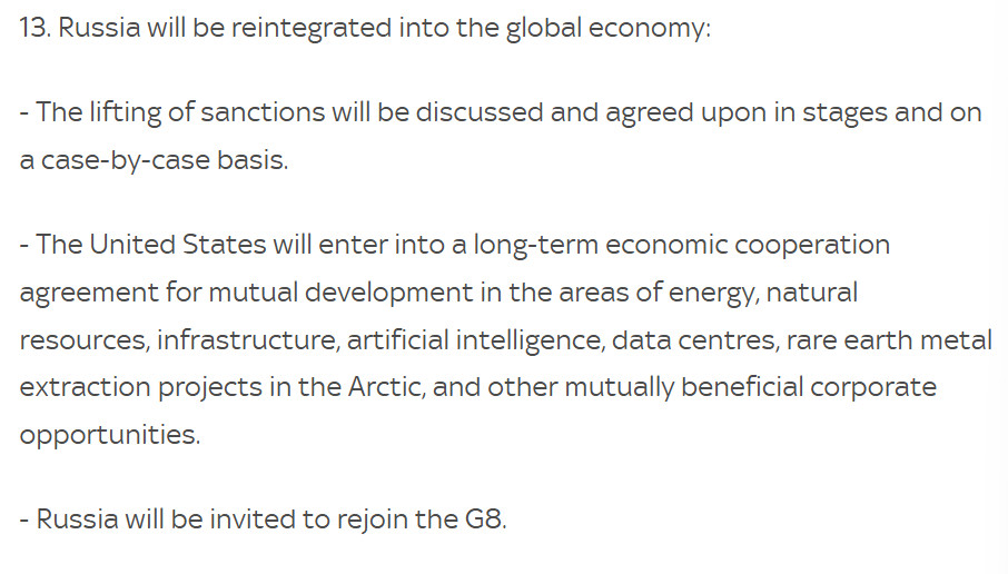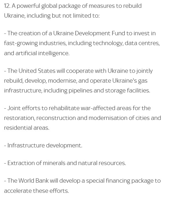 Maar hoewel de territoriale wijzigingen de meeste aandacht krijgen, zijn de economische bepalingen misschien wel belangrijker. Punt 12 bevat de algemene bepalingen rond de wederopbouw van de Oekraïense economie, met een zeer prominente rol voor de VS en de Wereldbank.