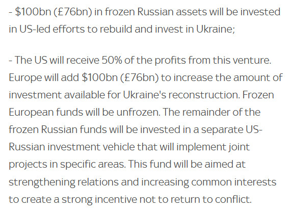 Dat blijkt ook uit de wijze waarop het reconstructiefonds aan het geld gaat komen. Dat zal voor een deel zijn uit bevroren Russische deviezen, en uit Europees geld. De VS krijgt minstens vijftig procent van de “winsten” uit dit initiatief (wat laat zien dat er winst gemaakt gaat worden op de wederopbouw).