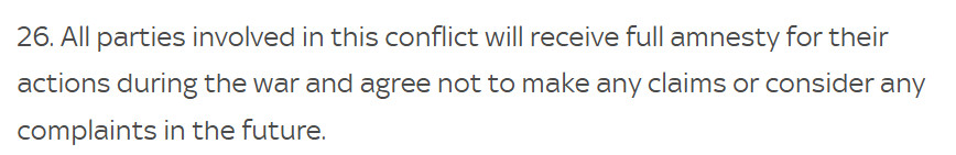 Dat blijkt ook maar weer uit de amnestiebepaling: alle partijen worden vrijgepleit van hun oorlogsmisdrijven en schendingen van internationaal recht. Beide partijen hebben zich daaraan schuldig gemaakt, maar Rusland draagt een grotere schuld door haar agressie. Dat wordt nu vergeven.