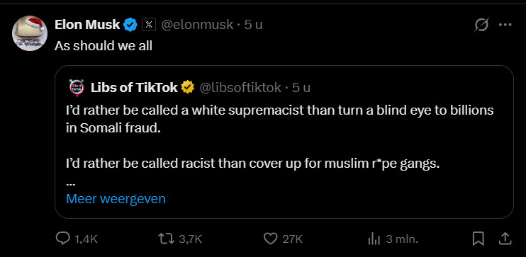 Daarnaast zijn er nog een paar normale posts, en er zijn nog een paar linkse stemmen op het platform, maar het bovenstaande is een heel groot deel van wat X op dit moment onderscheid van andere platforms. Ragebait en posts die expres verwarring zaaien.