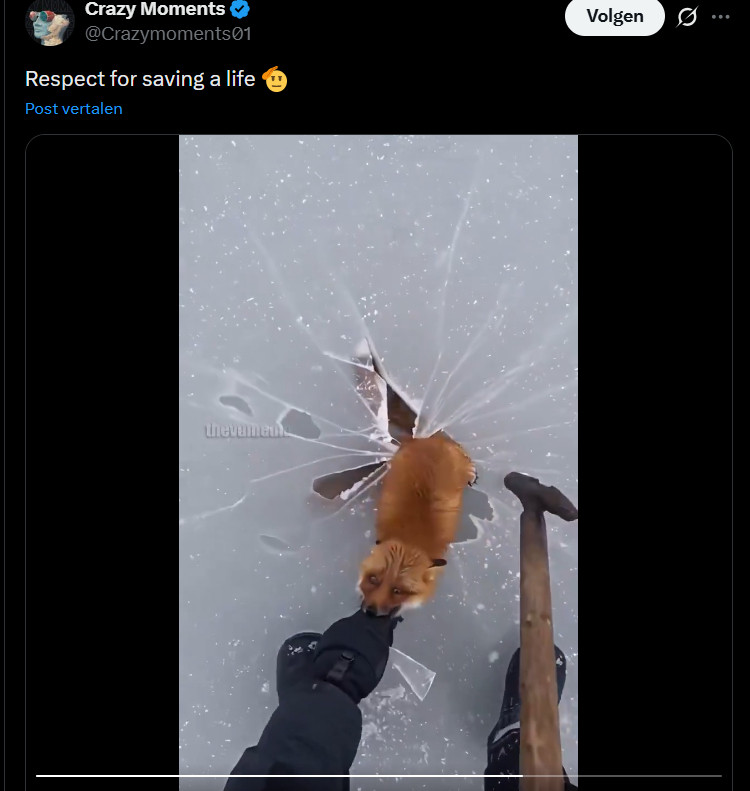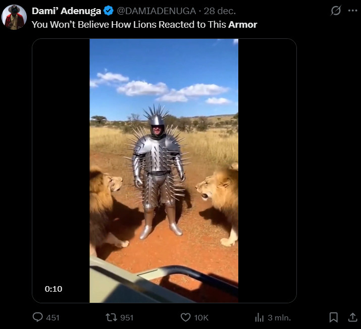 En dan hebben we nog de vele AI-filmpjes, vaak van dieren maar ook van “gebeurtenissen”. “Dier onder het ijs” is nu populair, maar het verandert vaak. Een tijdlang was “persoon valt door een glazen luchtbrug” een thema. “Persoon in een harnas met leeuwen” is ook iets nieuws.