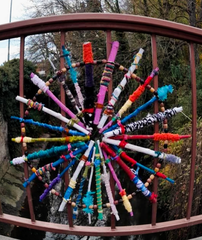 (Over de beide foto’s: “Een brug vol verhalen. Tijdens NovemberWereldmaand 2025 kreeg een brug in Halle een nieuw kleedje. In een sociaal-participatief traject brachten Karin en Mieke mensen samen om praatstokken te maken. Die verhalen kwamen later samen in cirkels, in samenwerking met Basisschool De Leerboom, Open Armen vzw, Dagcentrum De Wip, Buurtwerk Vogelweelde en Don Bosco Zennedal vzw. Voor de elfde keer werd zo rond een mondiaal thema gebouwd aan verbinding.)