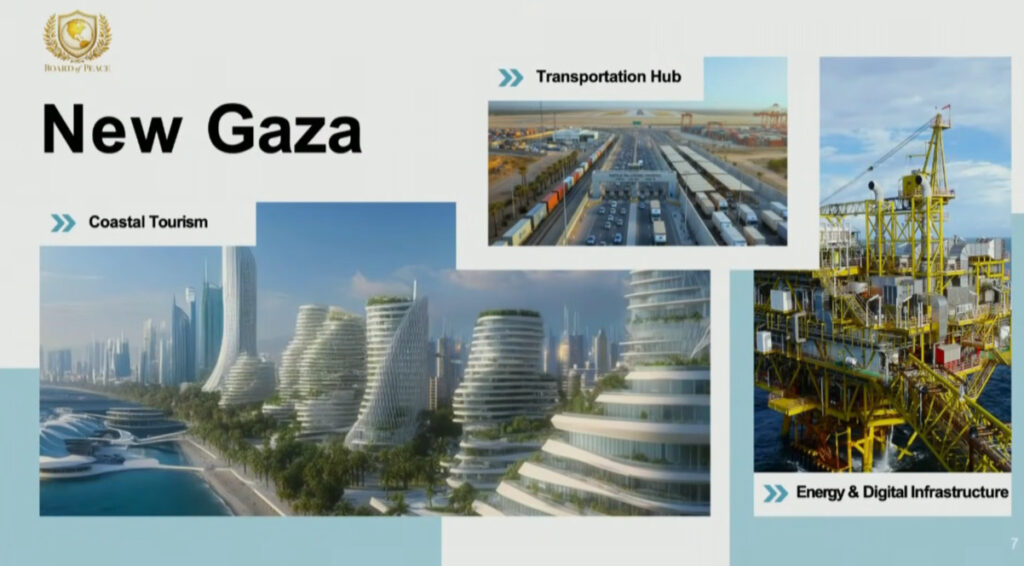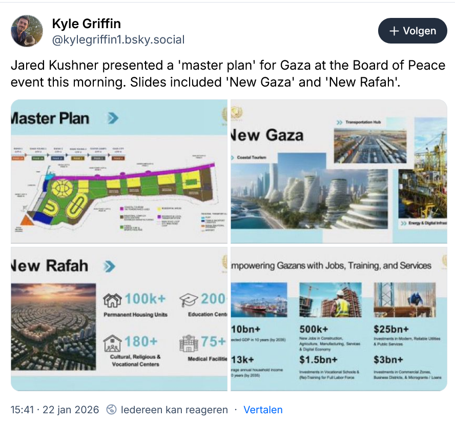 Dat blijkt ook in de praktijk. Jared Kushner, onderdeel van het “executive board”, presenteerde het plan voor een herbouwd Gaza als een vastgoeddeal. Ongetwijfeld zal de ‘Vredesraad’ veel investeerders aantrekken, voor winst of voor de gratie van Donald Trump.