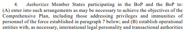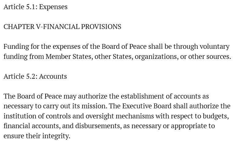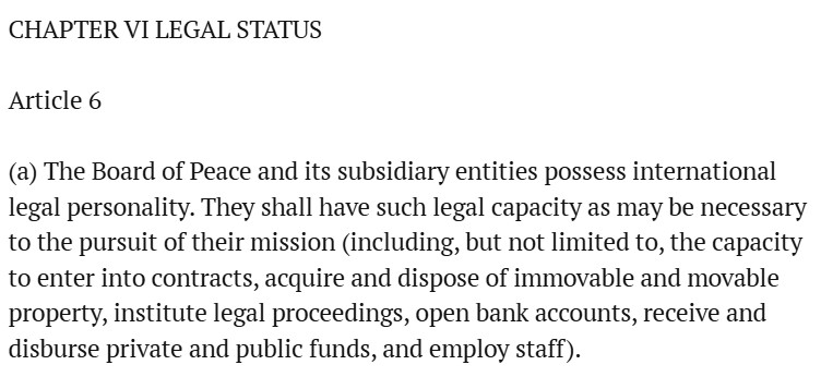 En hier komt de aap uit de mouw. Waarom is de ‘Vredesraad’ een internationale organisatie?Omdat een internationale organisatie zich niet hoeft te houden aan dezelfde regels als bedrijven. De ‘Vredesraad’ heeft internationale juridische persoonlijkheid, en is dus juridisch geen private entiteit.
