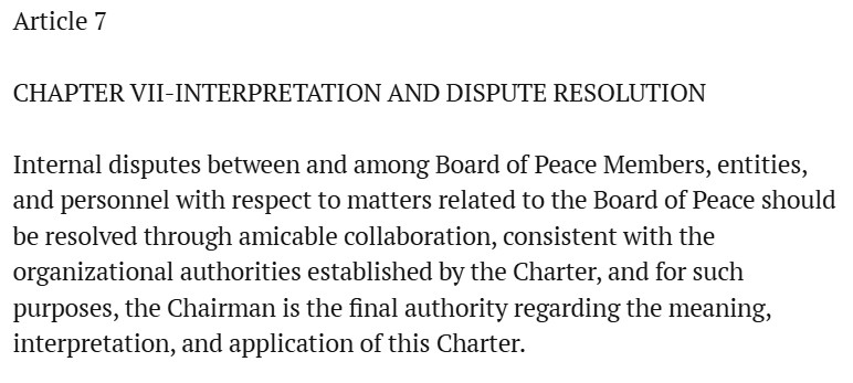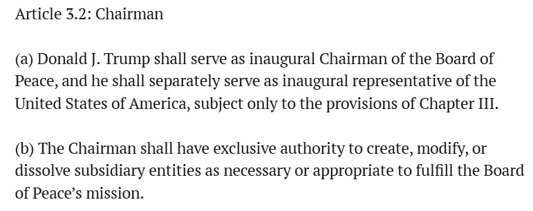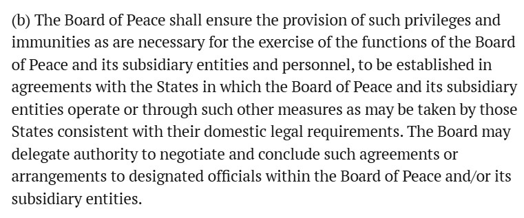 De ‘Vredesraad’ heeft zichzelf expliciet de mogelijkheid gegeven om overeenkomsten te sluiten met landen met daarin regels rond immuniteit. Dus straks kan President Donald J. Trump met Voorzitter Donald J. Trump een overeenkomst sluiten rond zijn eigen immuniteit.