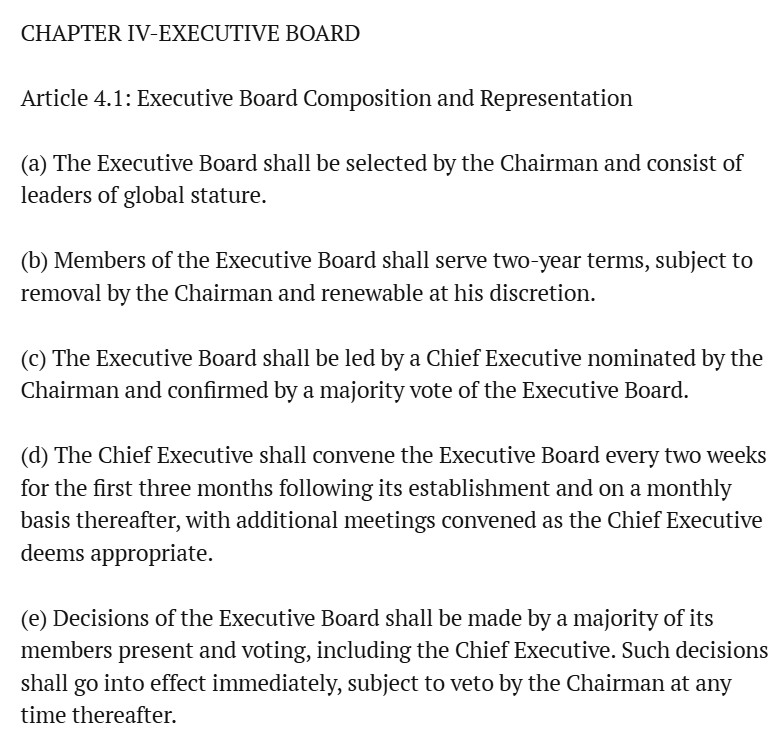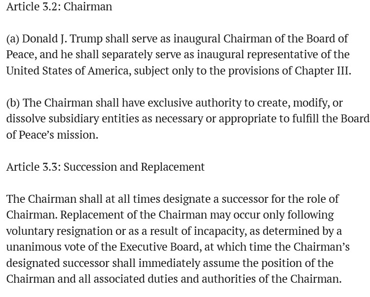 De ‘Board of Peace’ lijkt daarin meer op een bedrijf dan een internationale organisatie. Trump is als ‘Voorzitter’ de eigenaar, die uiteindelijk alles mag bepalen. De dagelijkse leiding ligt bij een “chief executive” (feitelijk een CEO), die persoonlijk worden aangesteld door de eigenaar.
