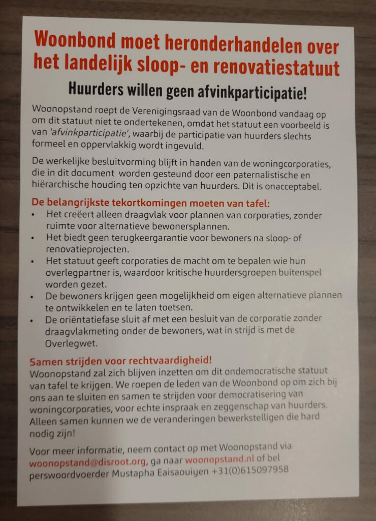 “Woonopstand roept de verenigingsraad van de Woonbond vandaag op om dit statuut niet te ondertekenen”, aldus de tekst van de flyer, “omdat het statuut een voorbeeld is van ‘afvinkparticipatie’, waarbij de participatie van huurders slechts formeel en oppervlakkig wordt ingevuld. De werkelijke besluitvorming blijft in handen van de woningcorporaties, die in dit document worden gesteund door een paternalistische en hiërarchische houding ten opzichte van huurders. Dit is onacceptabel.” Woonopstand laat in de flyer weten dat men zich zal blijven inzetten om het “ondemocratische” statuut van tafel te krijgen. En de leden van de Woonbond worden opgeroepen om zich bij Woonopstand aan te sluiten en samen te strijden voor democratisering van woningcorporaties, voor echte inspraak en zeggenschap van huurders.