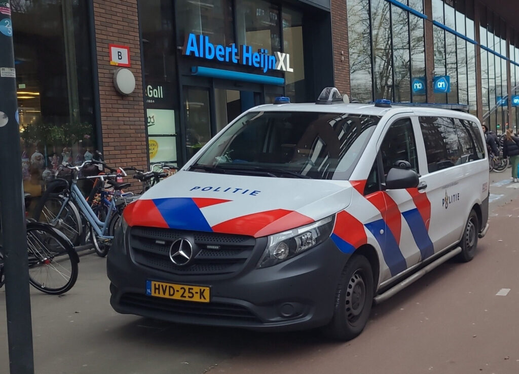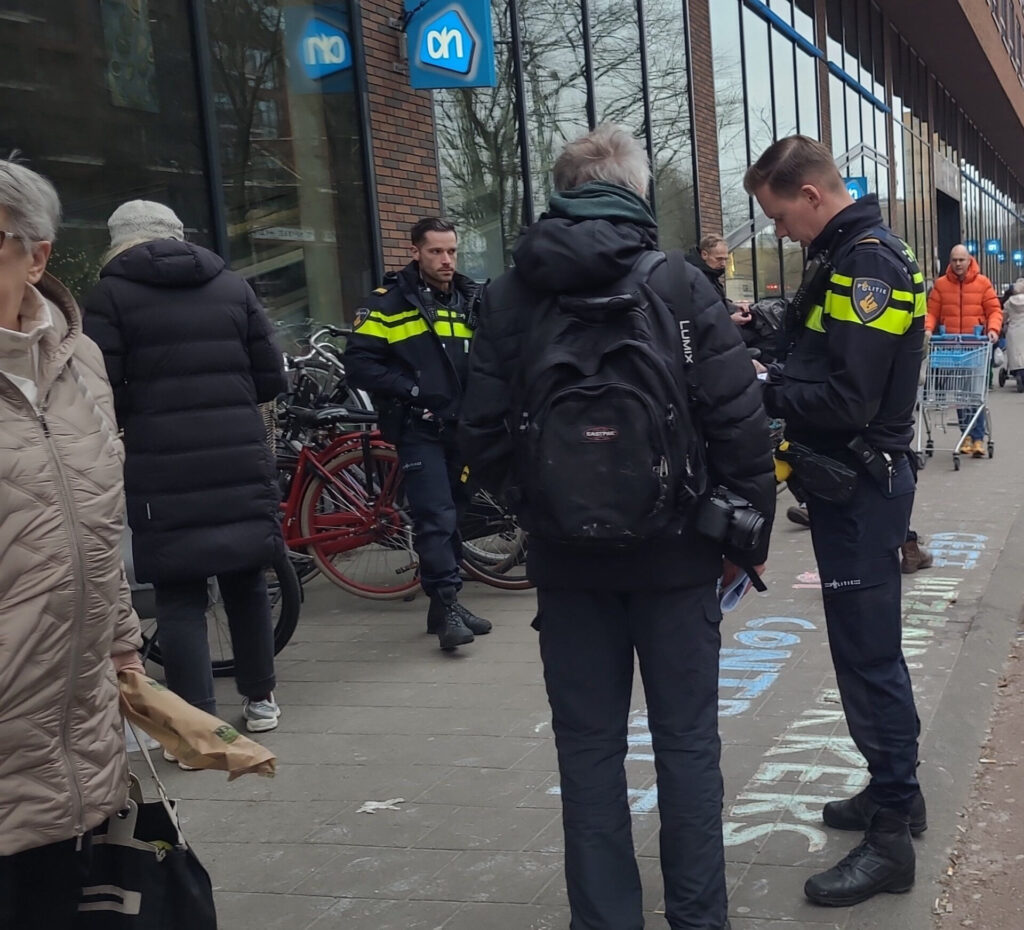 Toen het hem eindelijk duidelijk werd dat we niet zouden gaan meewerken, droop hij af. Hij ging naar binnen en belde de politie. Een half uur later kwamen er maar liefst zes agenten. Bijna evenveel als er actievoerders waren. Ze leken met de publieksvriendelijke actie geen moeite te hebben, behalve dan dat we hem niet vooraf hadden aangemeld. Maar dat doen we in de meeste gevallen niet meer, want dan krijg je een reeks onzinnige beperkingen opgelegd. Ze gingen overleggen of we door mochten gaan, maar uitsluitsel daarover hebben we niet meer gekregen voordat we onze actie afbliezen, toen het vooraf onderling afgesproken uur erop zat.