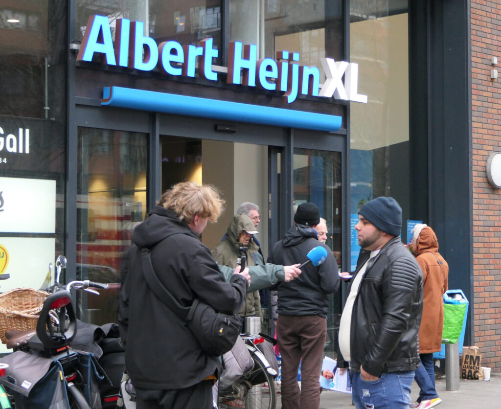 Van sommige langslopende klanten viel de mond open, toen ze de man met het officiële AH-naambordje op zijn borst zo agressief tekeer zagen gaan. Hij bleef duwen en trekken en probeerde tot drie keer toe mijn flyers af te pakken. Toen ik mijn mede-actievoerders vroeg of ze even wilden filmen, riep hij dat hij de camera uit de handen zou slaan van wie dat durfde.