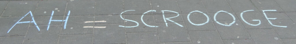 Anders dan bij enkele van de vorige krijt/flyeracties bood de lokale manager dit keer geen koffie aan, maar kwam die schuimbekkend naar buiten, terwijl hij riep: “Jullie gaan hier nu weg! Jullie gaan hier nu weg! Het is klaar!” Toen ik zei dat we gewoon zouden blijven flyeren en krijten, en dat zijn collega’s elders er ook geen moeite mee hadden, werd hij handtastelijk. “Jullie zijn mensen die nooit meewerken”, zei hij, terwijl hij begon te duwen en trachtte om mijn flyers af te pakken. “Oh, kennen we elkaar dan?”, antwoordde ik ludiek, terwijl ik me schrap zette en me niet liet verwijderen.