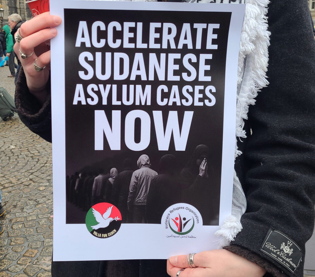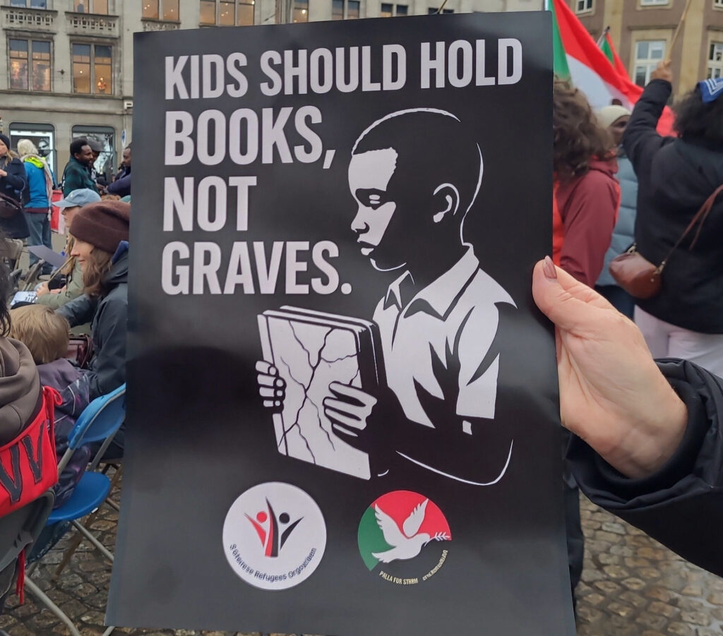 Op de Dam vond eerst een manifestatie plaats met veel sprekers – naast Soedanezen onder meer iemand van Palestijnse herkomst en ook een vertegenwoordiger van de Dolle Mina’s – die indrukwekkende toespraken hielden. De strijdbare en enerverende sfeer bleek ook uit de grote hoeveelheid actieborden met teksten als “Open a direct refugee track. Sudan needs safe passage”, “Silence kills. Speak for Sudan”, “Stop funding the war in Sudan”, “Nederland, sta niet stil. Sudan brandt!”, “Black & white for Sudan. Wear the colors of resistance”, “Stop the massacres in El-Fashir & Bara” en “Genocide is happening now”. Opvallend was ook het meterslange spandoek “Wees een stem tegen genocide”, dat de strijd tegen de genocide in Soedan verbindt met het verzet tegen de genocide in Gaza en waar ook ter wereld.