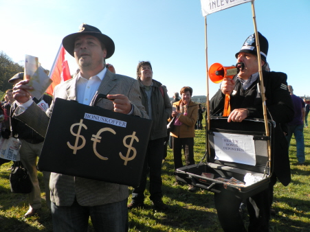 1. Bij bezoeken aan de tentenkampen en demonstraties, maar vooral op internet, valt bijna niet te ontkomen aan new age- en conspiracygeluiden. Van wat we meekrijgen van de protesten in de VS, speelt het daar bij concrete activiteiten nauwelijks een rol, en ook in Deventer hebben we er geen problemen mee gehad. Bij de demonstraties in Den Haag en Amsterdam was het echter soms wel even slikken wanneer je met een willekeurige mede-actievoerder sprak. New age-denken is volkomen gespeend van strijdbaarheid, en samenzweringsdenken leidt tot een nodeloos gevoel van machteloosheid jegens schijnbaar grote geheime krachten. Beide dragen zo niet bepaald bij aan de opbouw van de krachtige beweging die nodig is om het kapitalisme te beteugelen of zelfs te vervangen door een veel socialer systeem.