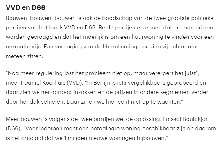 Dit zie je bij de VVD en D66: ook zij willen huurwoningen voor een “normale” prijs (nog een niets-term!), en ze willen betaalbare woningen. Maar in plaats van daadwerkelijke oplossingen zijn ze voor meer bouwen door particuliere verhuurders, die nog meer “onbetaalbare” woningen willen bouwen. En niet te vergeten de PVV en hun bruin-rechtse bende, die vooral migranten willen weren.