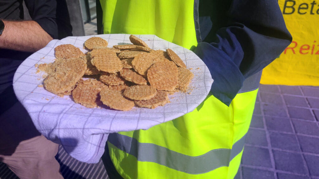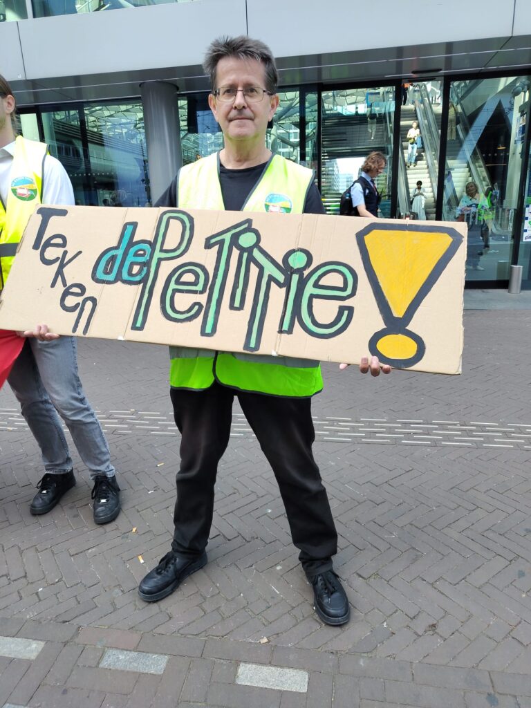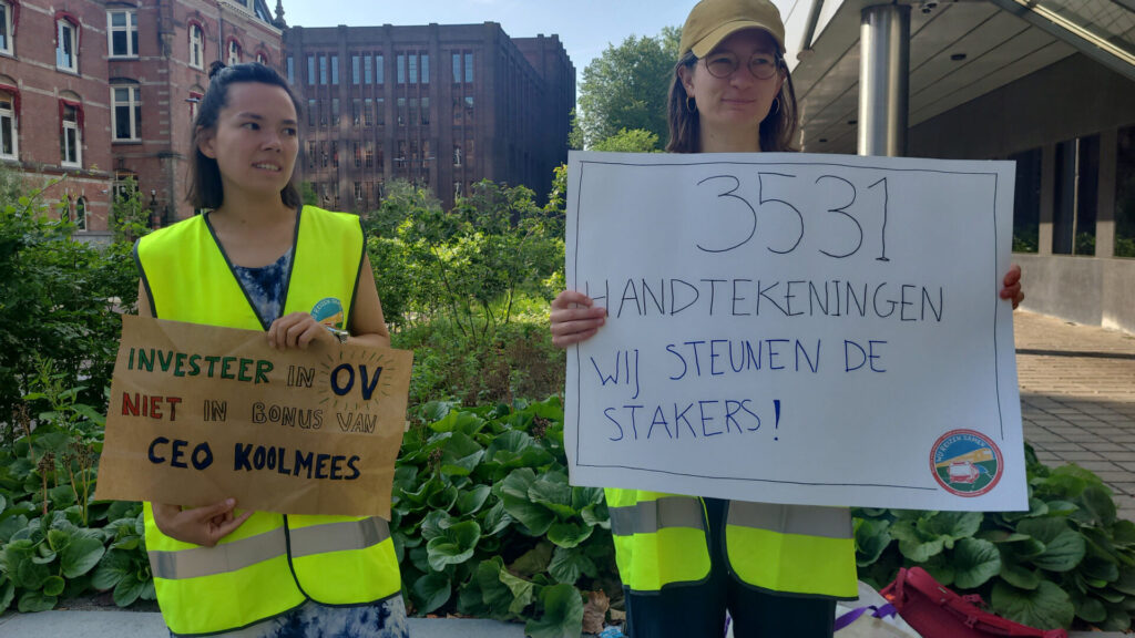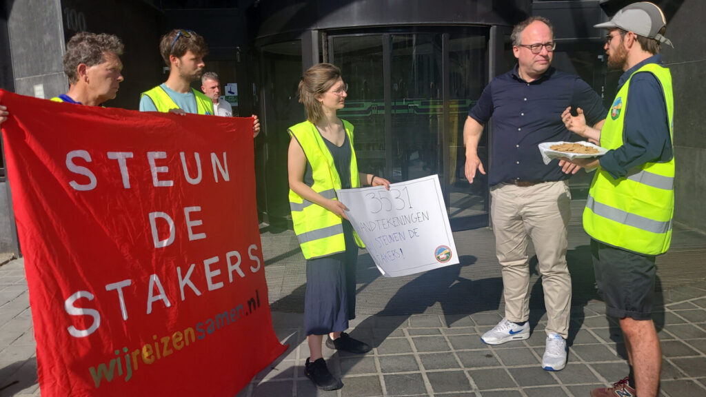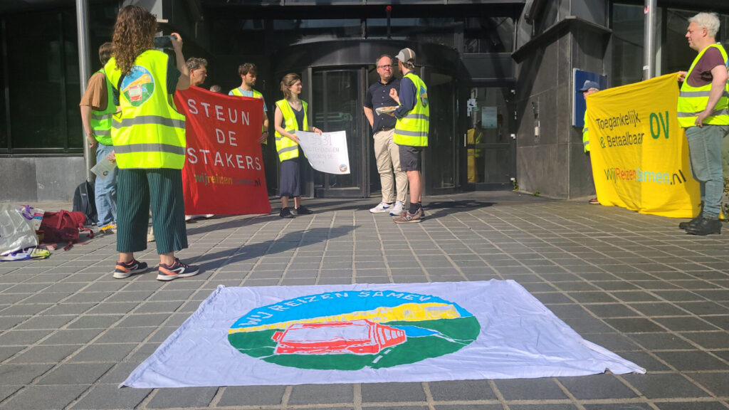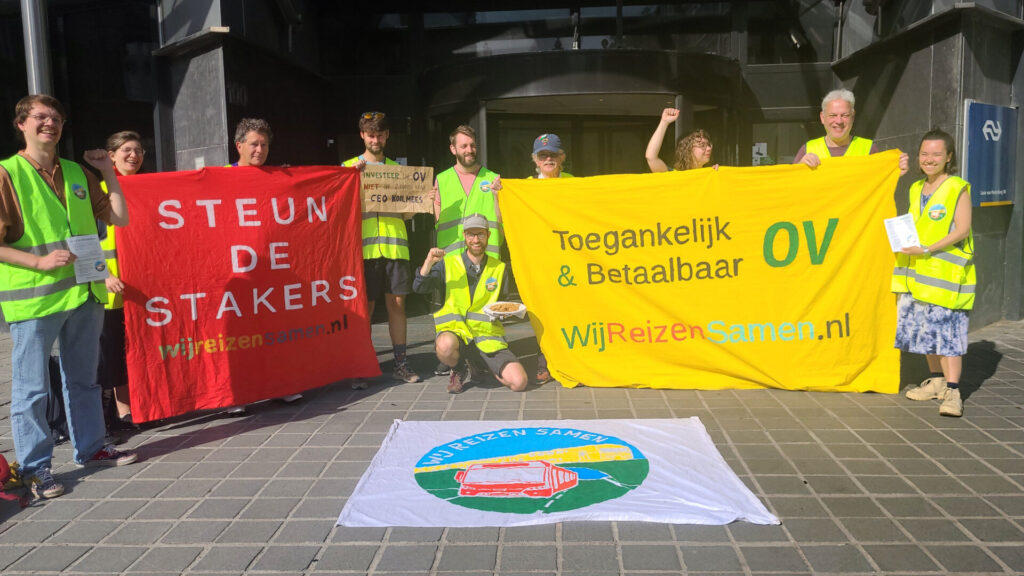 Vanmorgen kwam een tiental activisten van #WijReizenSamen (WRS), de landelijke campagne voor een beter openbaar vervoer, samen bij de ingang van het hoofdkantoor van de NS in Utrecht, vlakbij station Utrecht Centraal. Zij boden NS-baas en ex-vice-premier Wouter Koolmees een al meer dan 3.500 keer ondertekende petitie aan ter ondersteuning van de cao-eisen van NS-werkers, die al diverse dagen hebben gestaakt voor hogere lonen en betere arbeidsvoorwaarden. Vandaag zijn de NS-bazen warempel met een nieuw loonbod van 3,25 procent gekomen om daarmee de vakbonden weer aan de onderhandelingstafel te krijgen. Die schamele loonsverhoging is in feite nog steeds niet meer dan een aanpassing aan de inflatie die rond 3,3 procent ligt.