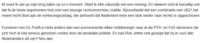Die esoterie kun je vaak herkennen aan bepaalde zinsneden, zoals “[x] doet het meest recht aan de verkiezingsuitslag”. De Jong gebruikt die ook. Nederland is volgens haar naar rechts opgeschoven, en daarom zou er ook een rechtse regering moeten komen.
