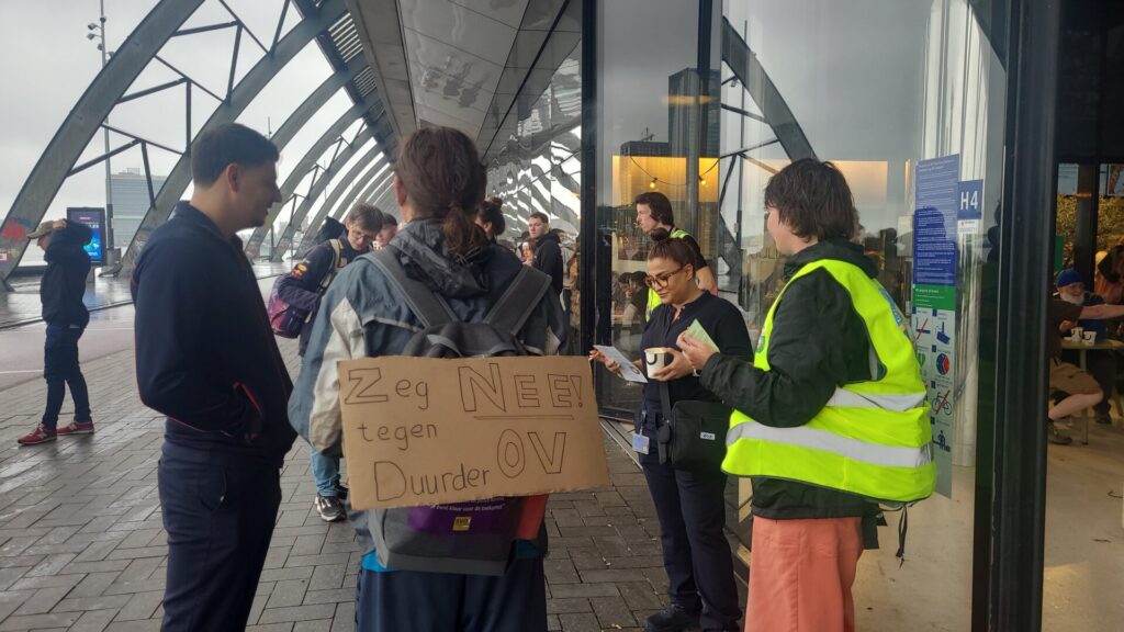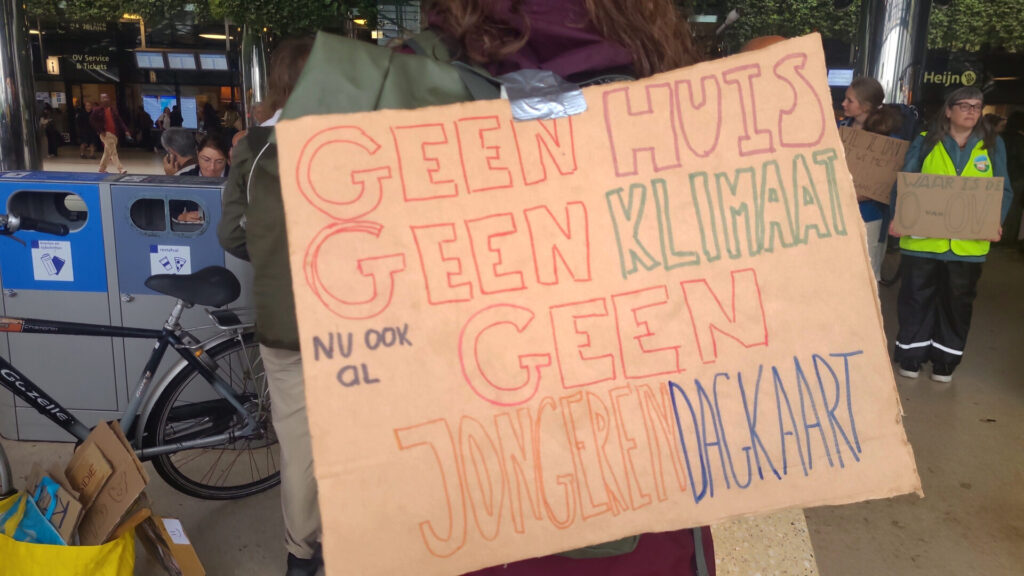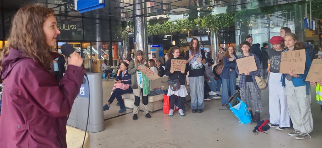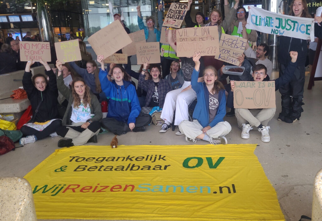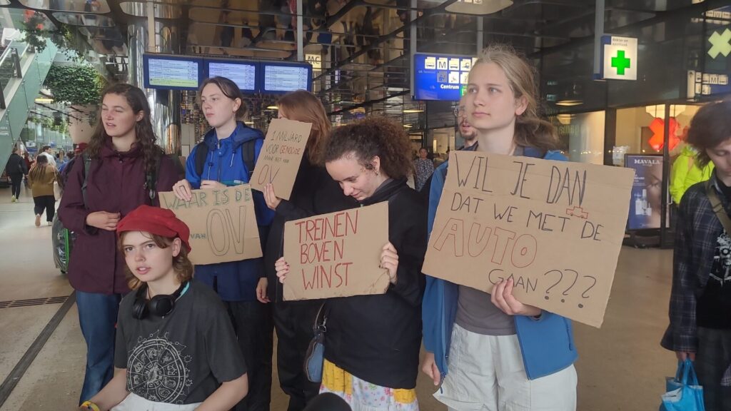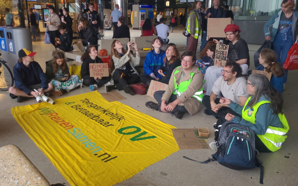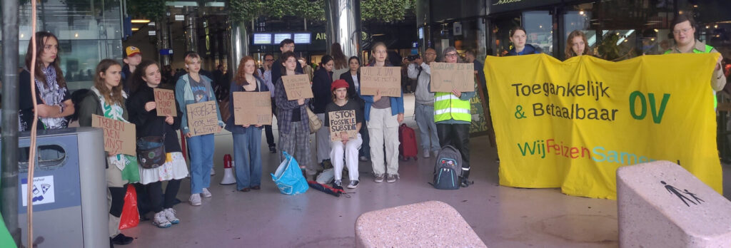 Gistermiddag vond in Amsterdam de sit in-actie plaats die was gericht tegen het flink duurder maken van treinreizen voor jongeren tot en met achttien jaar. De NS-bazen hebben namelijk per 1 juli de Jongeren Dagkaart Dal afgeschaft, wat betekent dat jongeren vooral voor langere treinreizen veel meer moeten gaan betalen. De actie was georganiseerd door de klimaatorganisatie Fridays For Future (FFF) met ondersteuning van #WijReizenSamen (WRS), de campagne voor toegankelijk en betaalbaar openbaar vervoer.