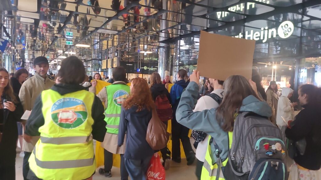 Onder de beschutting van het station en in de nabijheid van veel winkels en voorbijgangers konden zo’n twintig activisten het gelukkig droog houden, waarna het protest van start ging met toespraken, leuzen, spandoeken en flyers. Diverse WRS-activisten zagen kans om tijdens het uitdelen van hun flyers gesprekken aan te knopen met werkers van de NS en van ProRail. Ook reizigers en winkelend publiek werden bij het protest betrokken. De jongeren van FFF hadden veel actiebordjes meegenomen, niet alleen over de problemen in het openbaar vervoer, maar ook over de strijd tegen de klimaatcrisis. Ook de genocide in Gaza kwam tijdens de actie aan de orde. Er volgde nog een korte tocht door de hal van het station, die veel bekijks had. Daarna werden de drie toespraken nog een keer herhaald en uiteindelijk kon nog een heuse sit-in op een droge vloer worden gehouden.