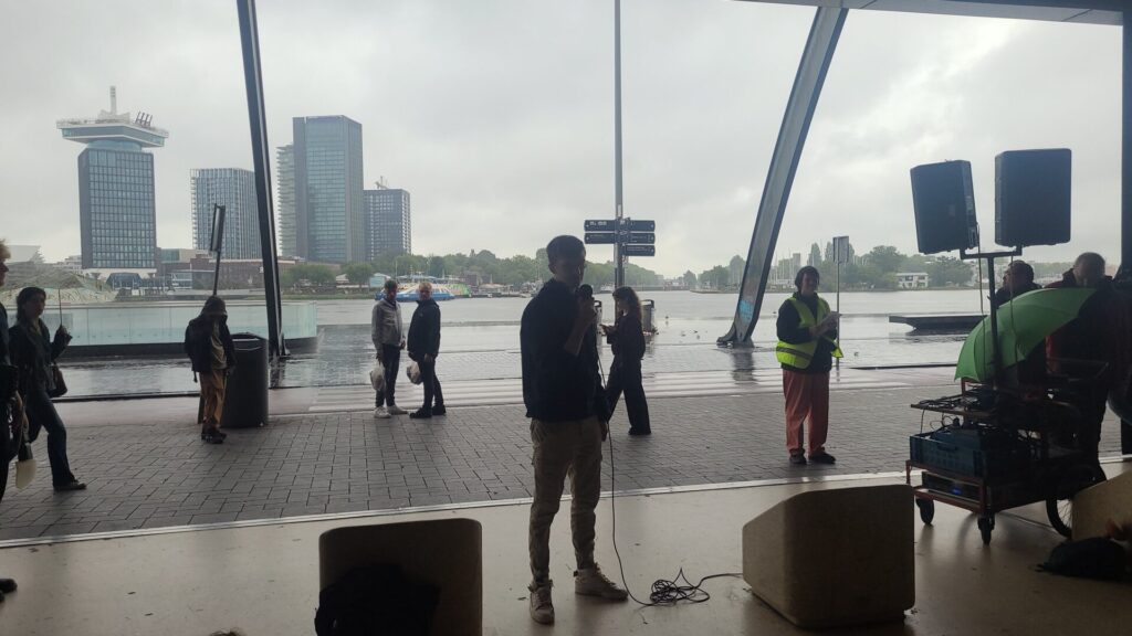Het was de bedoeling dat de deelnemers aan het protest zouden gaan zitten op het plein voor station Amsterdam Centraal. Maar door de aanhoudende regen was dat plein kletsnat geworden en dreigde de actie in het water te vallen. Gelukkig kon het protest toch doorgang vinden, mede dankzij de onvermoeibare inzet van de mensen van Theaterstraat, die het karretje met geluidsversterking uiteindelijk aan de andere kant van het station wisten te brengen, aan het IJ.