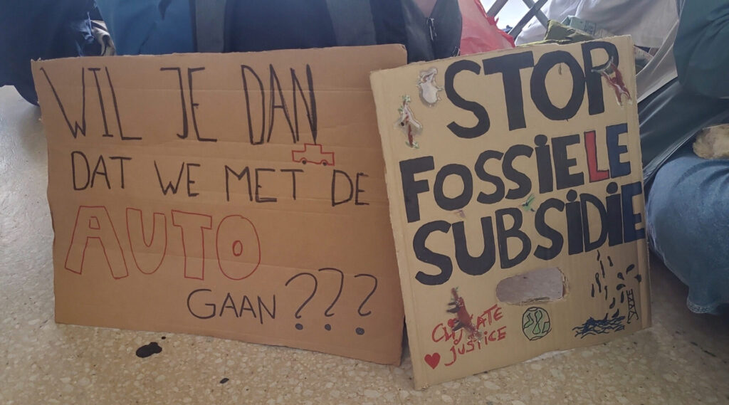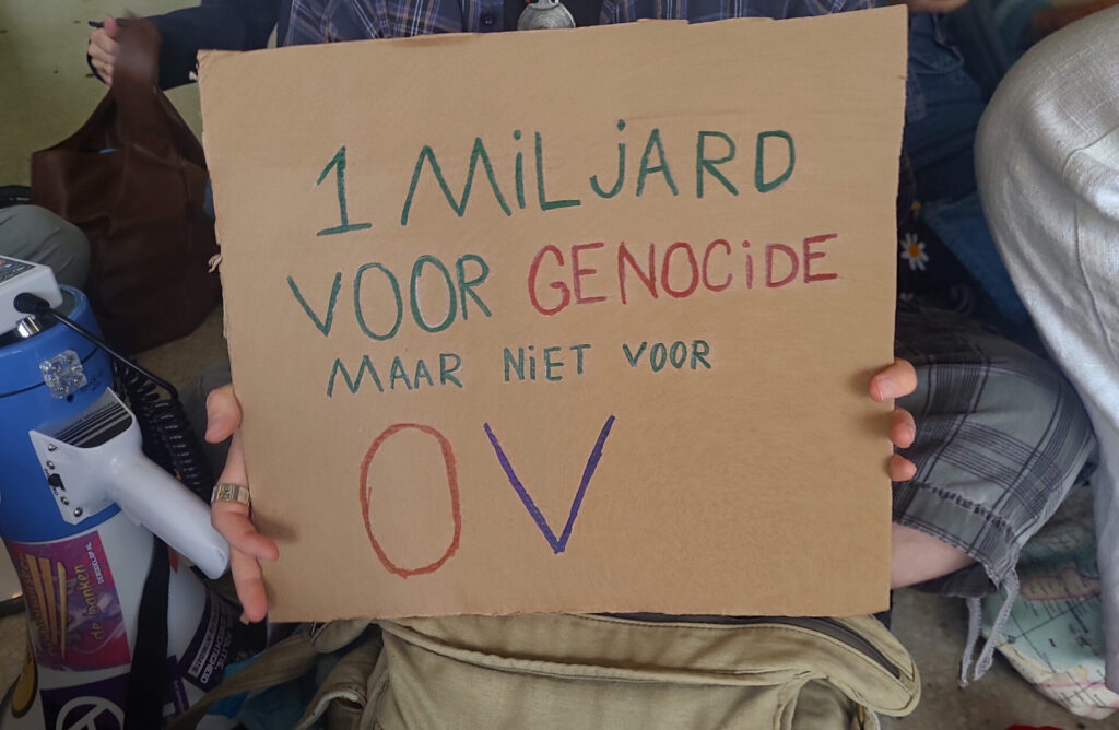Iedereen heeft recht op mobiliteit. Onze eis is daarom dat openbaar vervoer terug aan de mensen gegeven wordt. Niemand hoort te verdienen aan een basisvoorziening. Stop met de support van de genocide in Gaza en stop met het uitdelen van fossiele subsidies. Laat dat geld dan naar het openbaar vervoer gaan. Free Palestine!