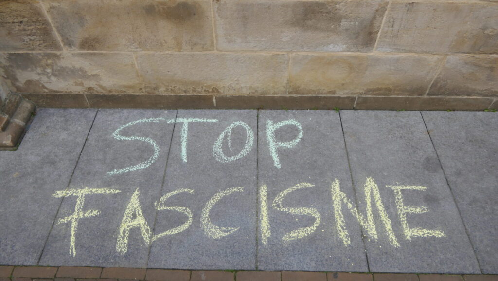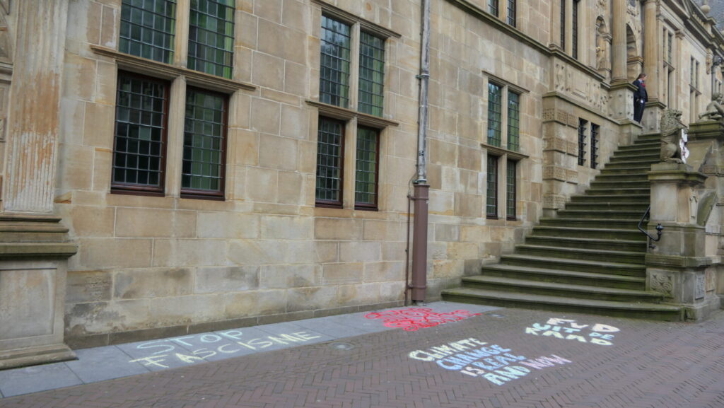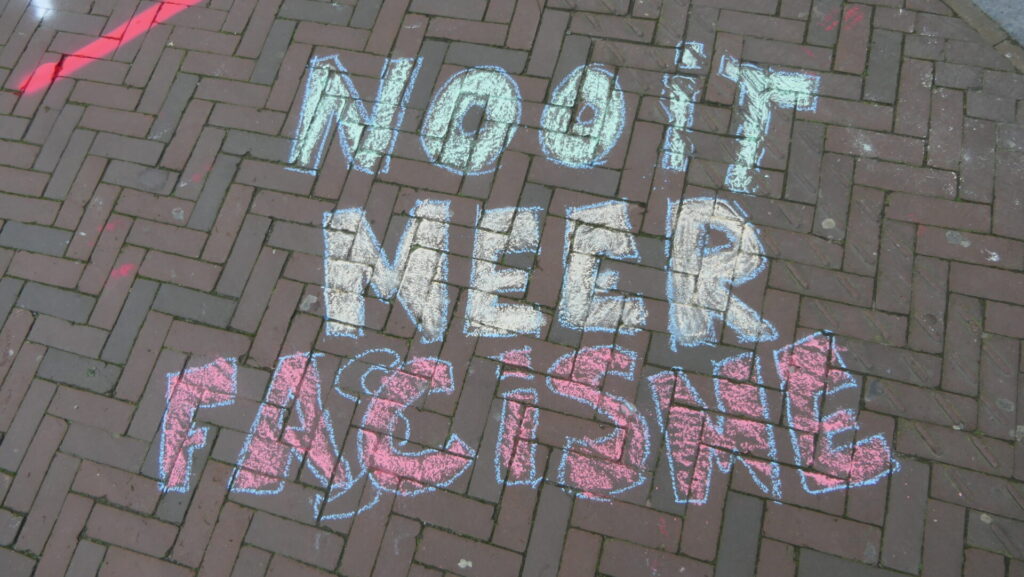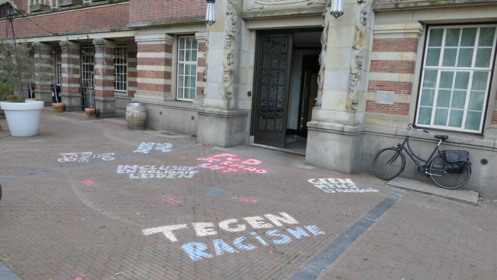 Vooraf aan de installatie van de nieuwgekozen raadsleden hebben een tiental anti-fascisten leuzen gekrijt bij de ingangen van het Leidse stadhuis. Met het protest wilden de actievoerders aandacht vragen voor een verklaring die de afgelopen twee dagen ondertekend is door maar liefst 23 Leidse organisaties. Hier de tekst daarvan: