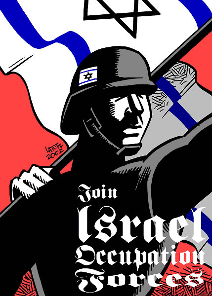 Omgewerkt nazi-propagandamateriaal. Cartoon stelt het leger van Israël gelijk aan de nazi-troepen. (Latuff) |