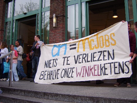 Euro-Mayday 2005. In Amsterdam werden discussies afgewisseld met acties tegen Albert Heyn, met zijn precaire personeelsbeleid....