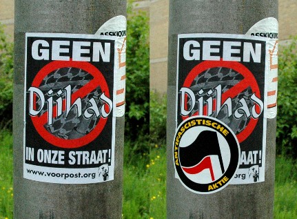 Stickers van Voorpost in Zoetermeer voor en na anti-fascistische behandeling