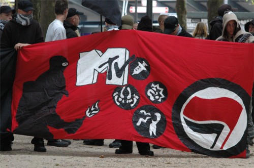 Het protest tegen MTV was georganiseerd door de Nationaal Socialistische Actie (NSA), dat is geďnitieerd door Jeugdstorm Nederland (JSN).(1) Op de demonstratie waren ook leden van het Aktiefront Nederland, en de oudgediende Eite Homan, kopstuk van het Racial Volunteer Force.(2) Al deze groeperingen staan een revolutionair en ‘anti-kapitalistisch’ nationaal-socialisme voor, in de geest van de Sturm Abteilung (SA) ten tijde van Hitler-Duitsland. De demonstranten posteerden zich voor de ingang van het terrein waar het MTV-feest plaatsvond. Nagenoeg iedereen was gekleed in het zwart en droeg een zwarte pet. Velen droegen ook een Palestina-sjaal. Het uiterlijk geheel deed denken aan een demonstratie van een links autonoom blok, een fenomeen dat al langer opgeld doet in extreem-rechtse kringen.(3) De NSA riep leuzen als “Tegen MTV en kapitaal, onze strijd is nationaal” en “Autonoom en militant: MTV moet aan de wand”.