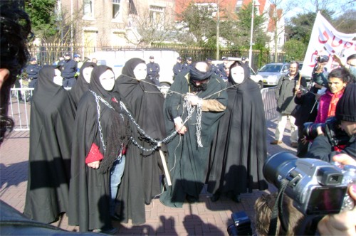 Theaterstuk tijdens demonstratie op 8 maart 2007 in Den Haag: vrouwen worden aan de ketting gelegd door sharia-wetgeving.