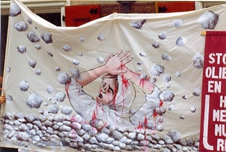 Protestspandoek tegen het bezoek van Faeze Hashemi Rafsanjani, dochter van de voormalige Iraanse president, in oktober 1998 in Leiden. Overspel moet volgens de sharia-wetgeving worden bestraft met steniging.