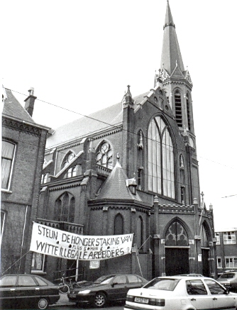 Hongerstaking van witte illegalen in Haagse Agneskerk in 1998 (foto: Esta Goossens)