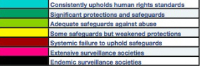 PI baseert de cijfers op wereldwijd onderzoek naar justitiële opsporingsbevoegdheden en bescherming van de privacy in 47 landen, inclusief alle 27 EU-landen.(1) Meer dan 200 experts van over de hele wereld werkten eraan mee, waaronder journalisten, academici, mensenrechtenadvocaten en nationale privacywaakhonden. Die keken vooral naar de identificatieplicht, de opslag van biometrische kenmerken van inwoners, wetten ter bescherming van de privacy, het afromen van telecommunicatie en opslag ervan, de grensbewaking, cameratoezicht en de bevoegdheid van staten om informatie op te vragen bij bedrijven.